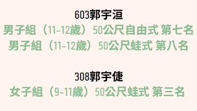 賀! 本校603郭宇洹、308郭宇倢 參加114年壢運盃游泳比賽 表現優異